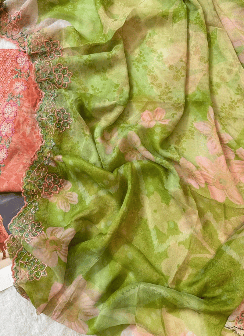 ☘️ Dupatta: Digital printed chiffon adorned with an embroidered border.